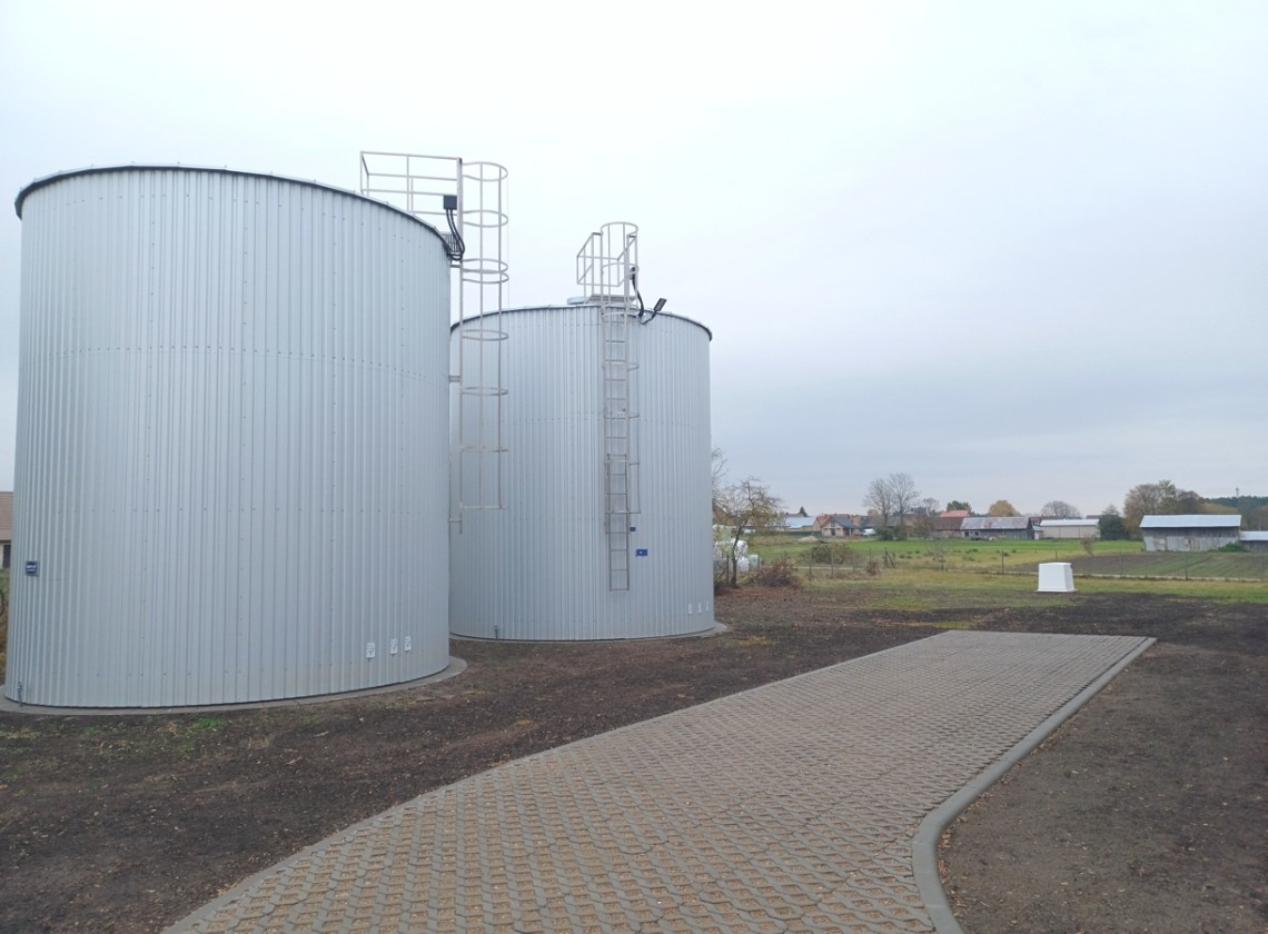 - montaż dwóch zbiorników wyrównawczych ze stali nierdzewnej o pojemności 150 m³ każdy wraz z izolacją i osłoną z blachy trapezowej;