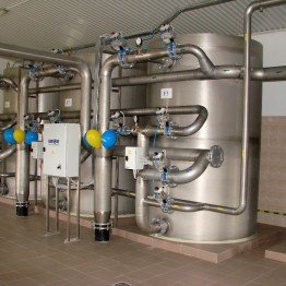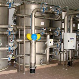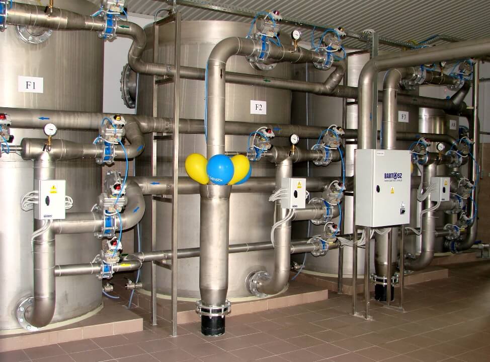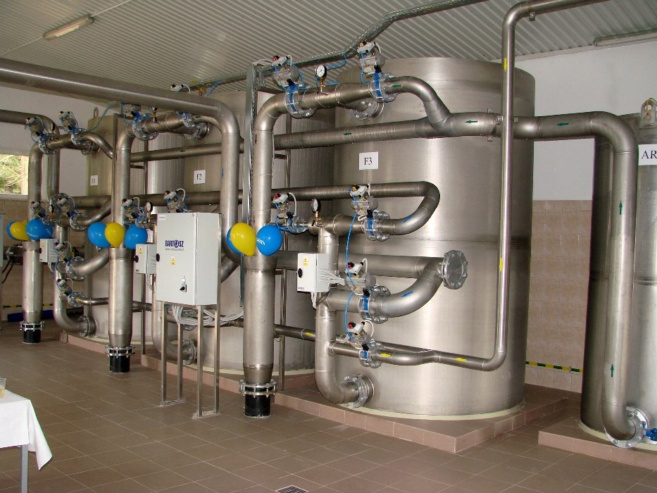 - napowietrzanie w systemie zamkniętym prod. Firmy Bartosz: filtracja na 3 filtrach pospiesznych dn 1870 mm, wykonane ze stali nierdzewnej gat. OH18N9, wypełnione złożami kwarcowymi; dostawa i montaż układu filtracji wód popłucznych; filtracja na dwóch filtrach pośpiesznych dn 900 mm, wykonane ze stali nierdzewnej gat. OH18N9, wypełnione złożami kwarcowymi i Hydro-anthrasit N, układu ultrafiltracji i lamy UV;