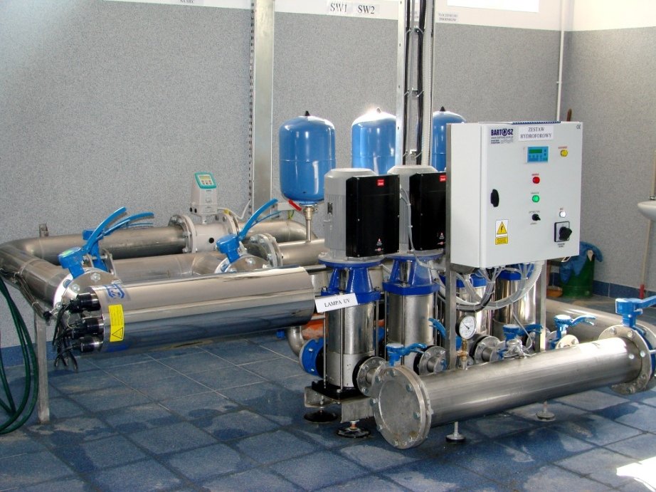 - wykonanie orurowania pompowni ze stali nierdzewnej wraz z armaturą, przepływomierzem elektromagnetycznym, lampą UV, blokiem zaworów bezpieczeństwa;