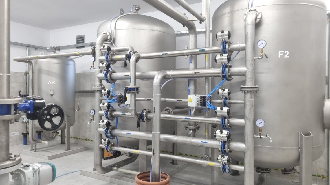 - filtrację jednostopniową (2 filtry pośpieszne DN 1600 mm ze złożami kwarcowymi i braunsztynowymi typu FEMEN),