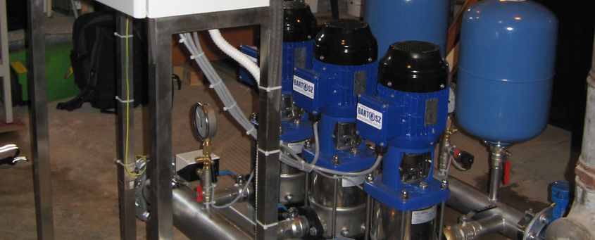 - Typ sterowania zestawem: płynne, z regulacją obrotów każdej pompy przetwornicą częstotliwości, z automatyczną pracą sieciową w przypadku awarii falownika